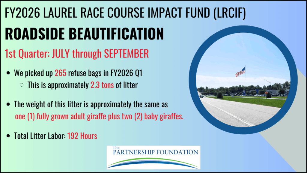 The LRCIF’s Roadside Beautification project is fully funded by the Laurel Race Course Impact Fund and includes year-long services, particularly; litter pick-up, removal, and collection: removal of unauthorized realtor and marketing signs on Route 198 from Corridor Marketplace to 3300 Fort Meade Rd Laurel MD and includes the 6 ramps at Routes 198 and 295 exits.